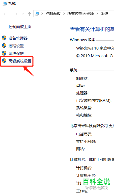 3. 第三步打开【系统】窗口后,根据下图箭头所指,点击左侧【高级系统设置】选项。