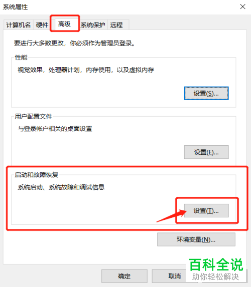 4. 第四步打开【系统属性】窗口后,先点击【高级】,接着根据下图箭头所指,点击【启动和故障恢复】菜单中的【设置】选项。