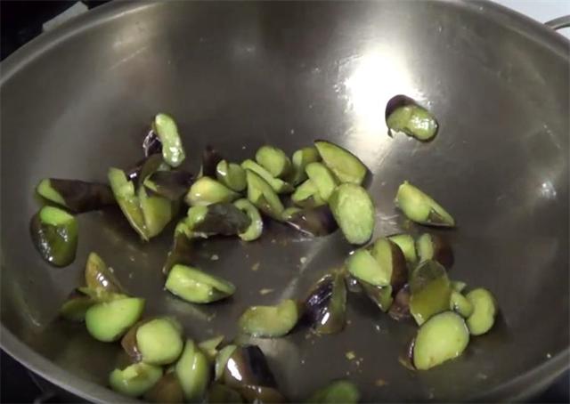 5.然后另起锅,加入少量的油,油热之后下入茄子,下锅之后快速的翻炒均匀,这样茄子表面会完全的沾上油,然后盖上锅盖焖20秒左右,之后再不断的按压茄子,茄子就会不断的变软了,等到茄子完全变软之后,就可以盛出了。