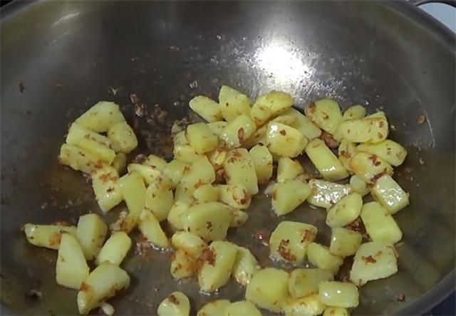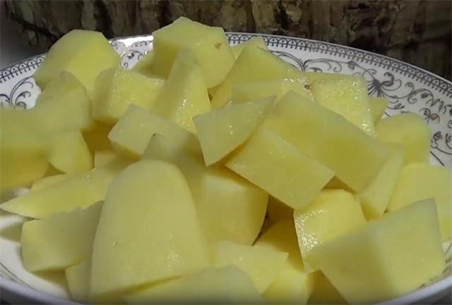 3.切土豆的时候,我们要注意一点,因为这里是省油版的,所以说土豆要切的小一点,土豆切成像这样的小块就可以了。