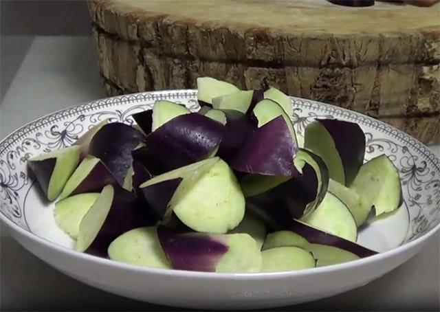 1.朋友们,大家好,今天我们来做一道省油版的地三鲜,用料同样是茄子土豆和青椒,首先我们把食材都切一下,茄子切成滚刀块。