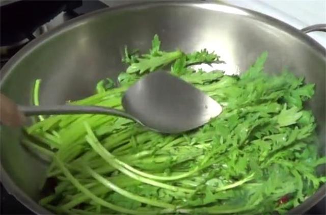 2.接着下入茼蒿,茼蒿下锅之后,改小火慢慢煎,煎的时候可以轻轻的按压,使茼蒿尽快的煎出汤汁。