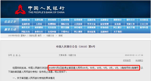早在2018年3月22日,央行就发布了四版币的退市公告。 该公告中提到,绝大部分四版纸币和四版1角硬币,将在2018年5月1日起停止流通。