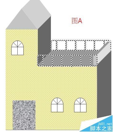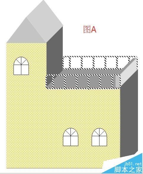 16、现在把这两个组合图形分别放在一楼的楼顶,如图A所示;现在再来做右侧的防护栏;在文档绘图工具栏中点“矩形”;