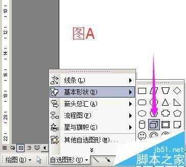 1、新建word文档;在文档的绘图工具栏中点选“立方体”图标;在文档上画下,画出立方体图形,把图形调成如图B的形状大小;