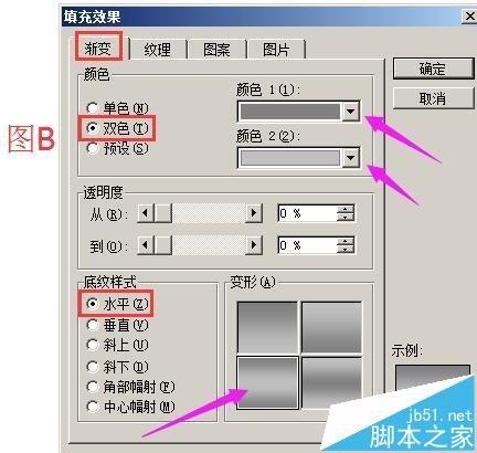 2、双击图形,弹出的“设置自选图形格式”操作框;在“线条颜色”这里点右侧的三角形,弹出的菜单中点“无线条颜色”;在“填充颜色”这里点右侧的三角形,弹出的菜单中点“填充颜色”;转到“填充颜色”操作框;如图B;在“颜色”这里选“双色”;在“颜色1”这里点选“灰色-50%”;在“颜色2”这里点选“灰色-25%”;在“底纹样式”这里点选“水平”;在“变形”这里点选下面排的第一个变形。然后,点确定。转回到“设置自选图形格式”操作框再点确定。