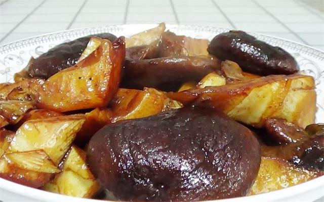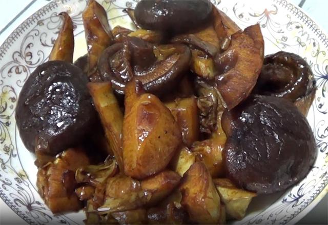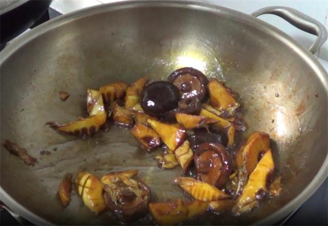 3.然后另起锅,加入稍多一点的油,油热后下入笋和香菇翻炒均匀,之后加少量的料酒,再加稍多一点的酱油炒匀,最后加入老抽,炒匀后,加入半碗水,再加一勺糖,盖上锅盖焖五分钟,焖好之后,再加少量的香油炒匀就可以出锅了。