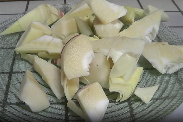 1.朋友们,大家好,今天我们来做一道香菇油焖笋,鲜嫩好吃,营养丰富,非常的给力。准备一根鲜笋,几个泡好的香菇,然后把笋切成滚刀块。(www.ws46.Com)