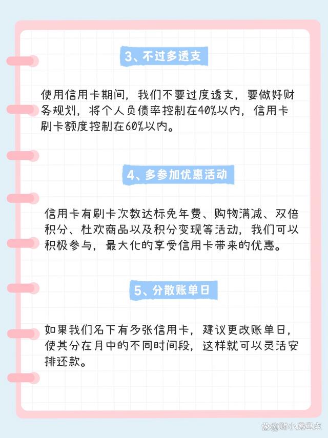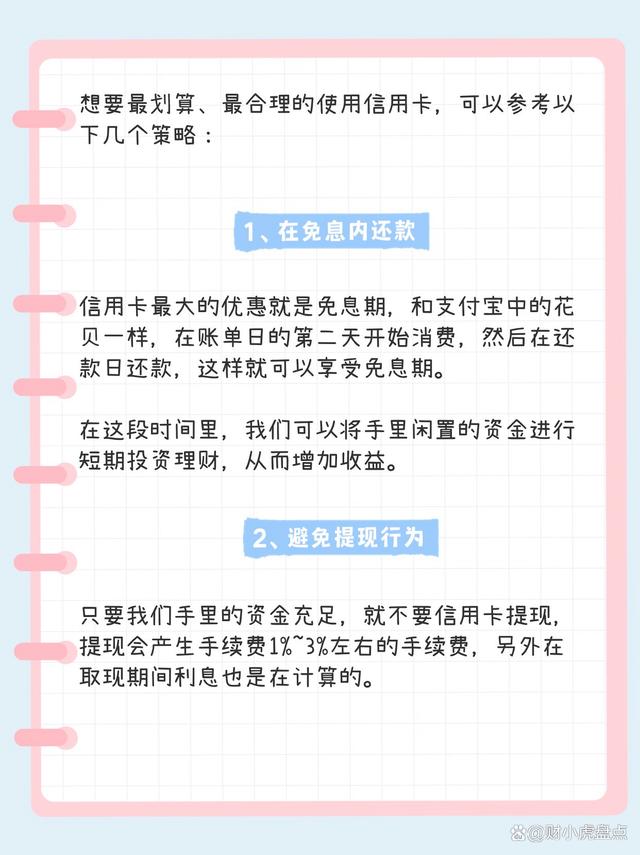 想要最划算、最合理的使用信用卡,可以参考以下几个策略: 1、在免息内还款 信用卡最大的优惠就是免息期,和支付宝中的花贝一样,在账单日的第二天开始消费,然后在还款日还款,这样就可以享受免息期。在这段时间里,我们可以将手里闲置的资金进行短期投资理财,从而增加收益。 2、避免提现行为 只要我们手里的资金充足,就不要信用卡提现,提现会产生手续费1%~3%左右的手续费,另外在取现期间利息也是在计算的。 3、不过多透支 使用信用卡期间,我们不要过度透支,要做好财务规划,将个人负债率控制在40%以内,信用卡刷卡额度控制在60%以内。 4、多参加优惠活动 信用卡有刷卡次数达标免年费、购物满减、双倍积分、杜欢商品以及积分变现等活动,我们可以积极参与,最大化的享受信用卡带来的优惠。 5、分散账单日 如果我们名下有多张信用卡,建议更改账单日,使其分在月中的不同时间段,这样就可以灵活安排还款。 |