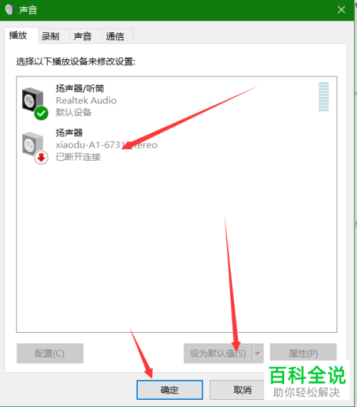 3.第三步,请大家在如图所示的新界面中点击扬声器xiaodu******,完成后选择默认,确定,操作完成。