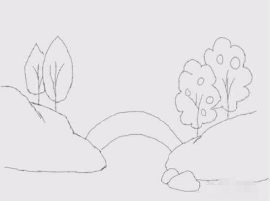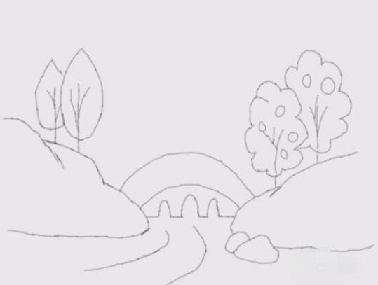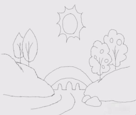 山水画一直都是中国人非常喜欢的一种,山水间表达的不仅仅是一种美丽的自然风光,更是画家们的精神世界的流露,也是一种人生态度的表达,那么山水简笔画怎么画呢? 1、在左侧的位置画出一个山形,如图所示: ![]() 2、在这个山形的右侧再画出另外的一个山形,如图所示: ![]() 3、在左边的山上画出两颗大树,如图所示: ![]() 4、在右侧的山上再画出两颗大树,如图所示: ![]() 5、在这两座山之间画出两条弧形作为拱形桥,如图所示: ![]() 6、在桥的下面画出桥上的涵洞,再在涵洞下面画出水流,如图所示: ![]() 7、在桥的上面画出太阳,这样简笔画山水风景就画好了。 ![]() 以上就是给各位带来的关于山水简笔画怎么画的全部内容了。 |
