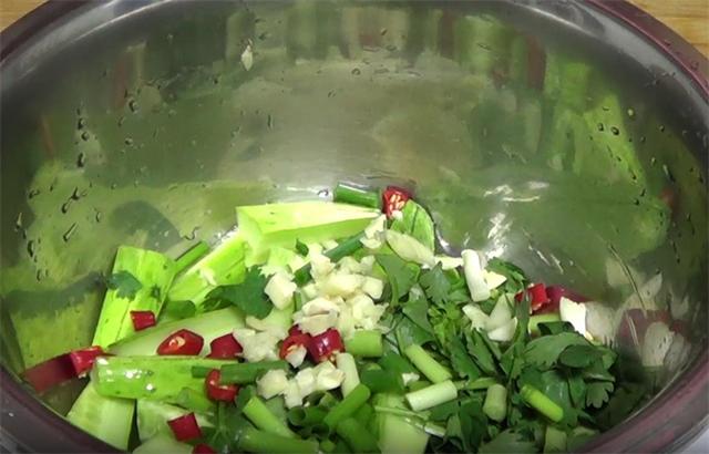 2.再把黄瓜切成条状,放入凉拌盆,再加入香菜、葱段、小米辣和蒜末。