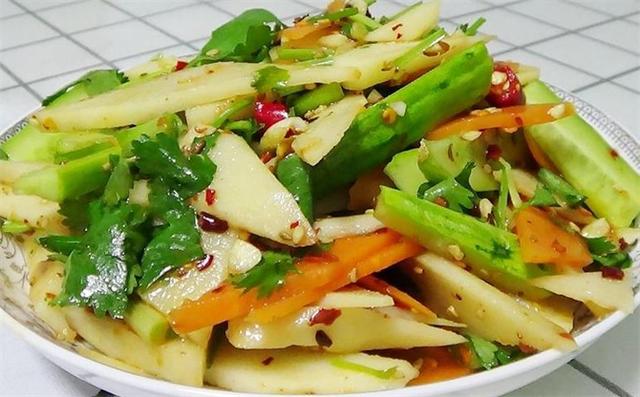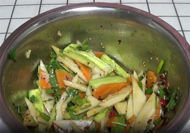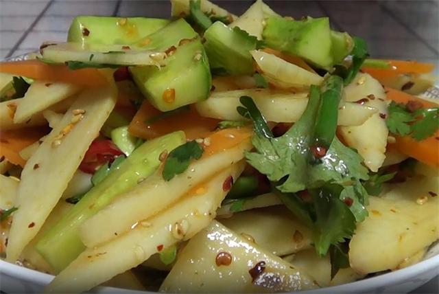 准备食材: 山药、黄瓜、胡萝卜、葱蒜、香菜、小米辣、白糖、盐、味精、酱油、白醋、香油、白芝麻、辣椒油 具体做法: