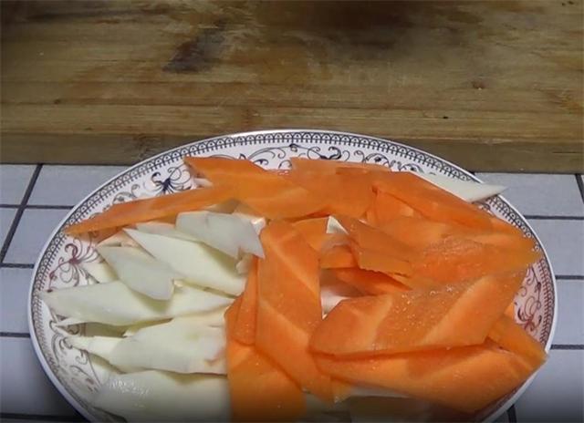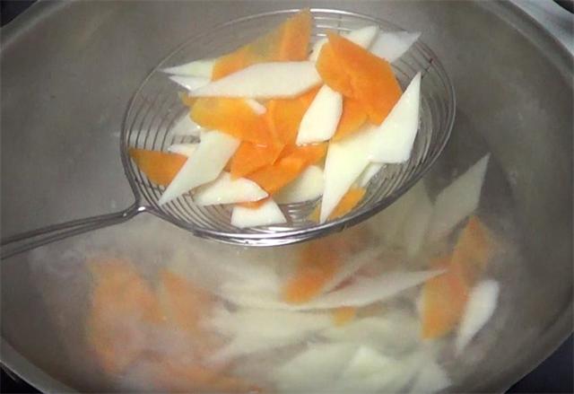 3.然后把山药和胡萝卜焯水,开水下锅煮两分钟后捞出,捞出之后,可以过一下凉水,放入凉拌盆中。