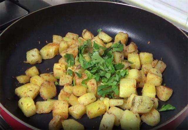 3.再准备一个平底锅,加入少量的油,下入土豆,中火把土豆煎至金黄,土豆煎好之后,我们加入孜然、辣椒粉,再加入少量的黑胡椒粉,加入适量的盐,最后撒上一些香菜末,翻拌均匀就可以出锅了。