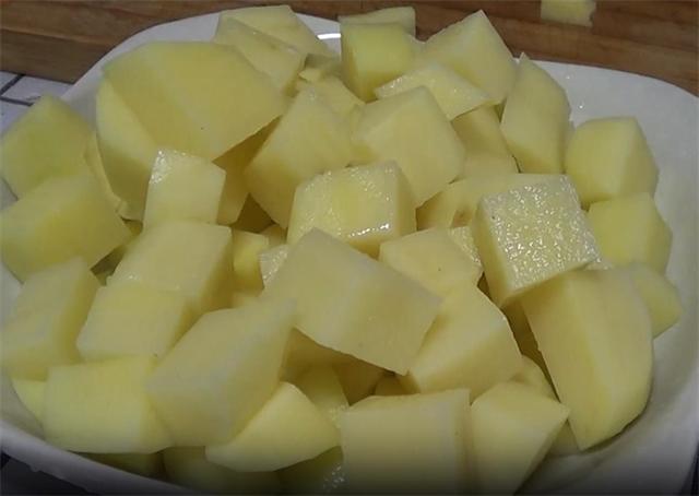 1.今天我们来做一个土豆的新吃法,香辣孜然土豆,土豆去皮洗净,我们把土豆切成小块。