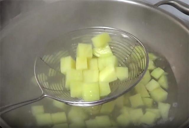 2.然后起锅把水烧开,倒入土豆,我们先把土豆煮熟,煮的时候可以加一些盐,土豆煮软之后,我们捞出沥干水分。