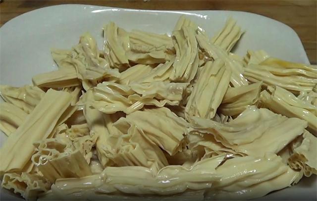 1.今天我们来做一个非常好吃的开胃小菜——凉拌腐竹,腐竹泡好之后,切成斜段。