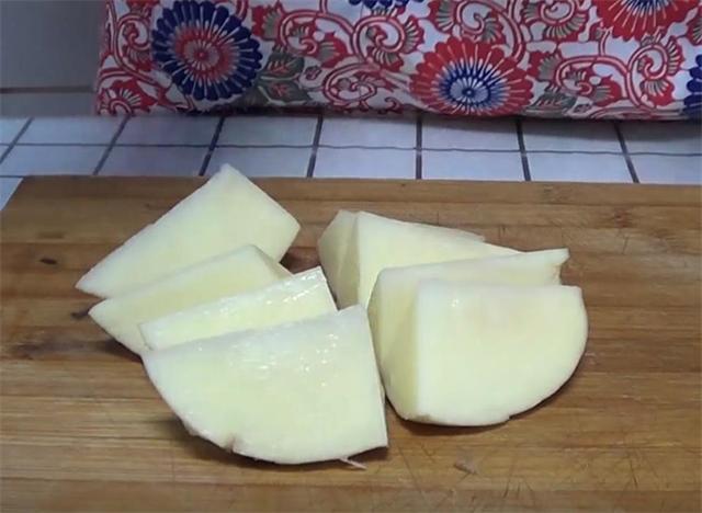 1.我们今天来做一个烤土豆,直接用烤箱就可以,土豆是买的这种新土豆,不用去皮,我们把它洗净擦干就可以开始制作了,我们把土豆切一下,把土豆切成稍大一点的三角块就可以了。