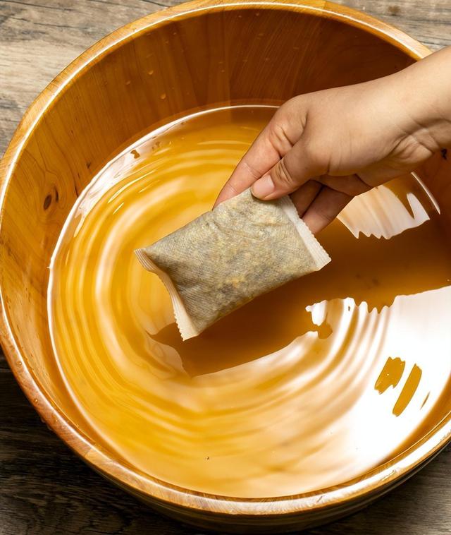 老姜辛温,能让肝气通达,温中散寒,最后的甘草调和众味草本,使得它们之间协作更顺利。 浓郁的草本香扑鼻而来,如果犯懒,省去提前煮泡脚包这步,我们就接上半通滚烫的沸水,把泡脚包丢进去,浸泡15分钟,期间可以用筷子搅一搅,加速成分的释放。