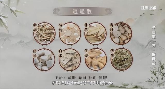 逍遥散这个方子就非常适合咱们肝气郁滞的朋友,它出自《太平惠民和剂局方》,把柴胡,当归,白芍,白术,茯苓各一两,炙甘草半两,另加烧生姜一块切破,薄荷少许,煎煮后泡脚使用。