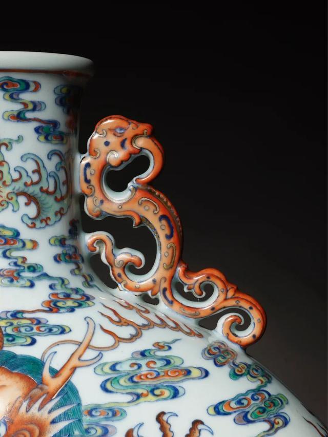 在这件瓷器上可以看出,象征帝王的矾红色龙居正中,龙爪抬起护佑小青龙,小青龙身体一半潜于海中阔跃在渊,这大概率也是乾隆对这位笑到了最后的儿子的一种认可吧,这件拍品的起拍价是七千万港币。