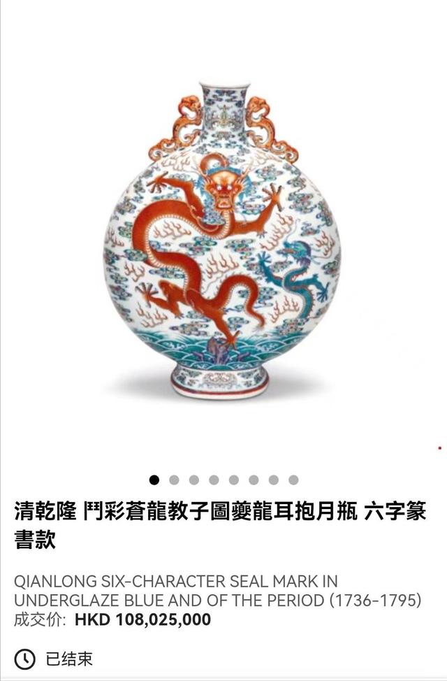 香港佳士得2023年春拍,推出了一件堪称国宝级的重器,全名叫做清乾隆斗彩苍龙教子图夔龙耳抱月瓶,据传这是要在1789年乾隆八十大寿的时候,赏赐给自己资质最平庸的十五子永琰的,也就是后来的嘉庆皇帝。
