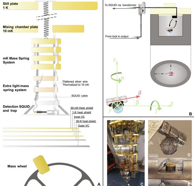 为了寻找量子引力理论的线索,我们需要在实验上探测引力和量子的交叉现象。比如,我们可以问,一个处于量子叠加态的物体,会产生怎样的引力场?或者,两个处于量子纠缠态的物体,会不会有引力纠缠?这些问题听起来很奇妙,也很有意义。它们可以帮助我们理解引力的本质,以及它和量子的关系。 但是,要回答这些问题,我们需要有一种方法,能够在实验室里精确地测量微小物体之间的引力。这并不容易,因为引力是一种非常弱的力,它很容易被其它的力所掩盖。比如,电磁力,摩擦力,空气阻力,热噪声等,都会对微小物体的运动产生影响,使得引力的效应难以观察。 那么,有没有一种方法,能够把微小物体从其它的力中隔离出来,只让它们受到引力的作用呢?答案是有的,那就是利用悬浮技术。悬浮技术是一种让物体在空中静止或运动的技术,它可以利用不同的原理,比如磁力,电力,声力,光力等。悬浮技术可以把物体从接触力,摩擦力,空气阻力等干扰因素中解放出来,使得物体的运动更加自由和灵敏。如果我们能够用悬浮技术来操纵微小物体,那么我们就有可能测量它们之间的引力。 这就是最近发表在《科学进展》上的一篇论文的主要内容。这个实验的主要设备是一个由钽制成的超导陷阱,它的形状是一个圆柱体,高度为10厘米,直径为5厘米。这个超导陷阱的作用是产生一个稳定的磁场,用来悬浮一个磁性粒子。这个粒子的质量为0.4毫克,直径为0.5毫米,由氧化铁和树脂制成。这个粒子被放在超导陷阱的中心位置,然后用一个低温制冷机,把超导陷阱的温度降到4.2开尔文,使得它进入超导状态。这样,这个粒子就被磁悬浮在空中,而且可以在三个方向上自由振动。