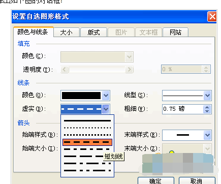 上图,选择“颜色与线条”选项卡。 这样,就得到虚线了,如上图. |