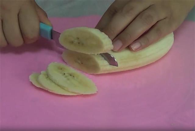 1.今天我们来做一个好吃的香蕉烤吐司,准备适量的吐司面包,一根香蕉、少量的白砂糖、少量的黄油,香蕉去皮之后,我们斜刀切成片状。