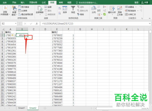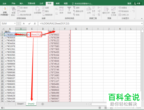 2. 然后在“编码1”列后面的列中,输入公式=VLOOKUP(A2,Sheet2!E:F,2,0),公式中的A2表示要比对的第一个单元格,Sheet2!E:F则表示被比对的数据所在位置,后面的2表示返回被比对数据的第几列,0表示精确查找。