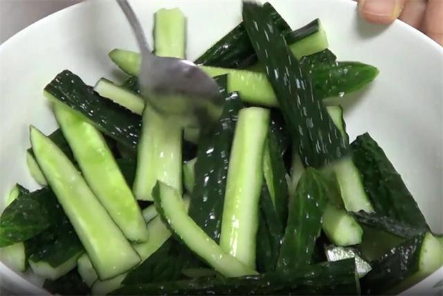 2.切好之后,装入大碗中,我们先把它腌制一下,然后加入两勺食盐,把黄瓜条杀水半个小时。