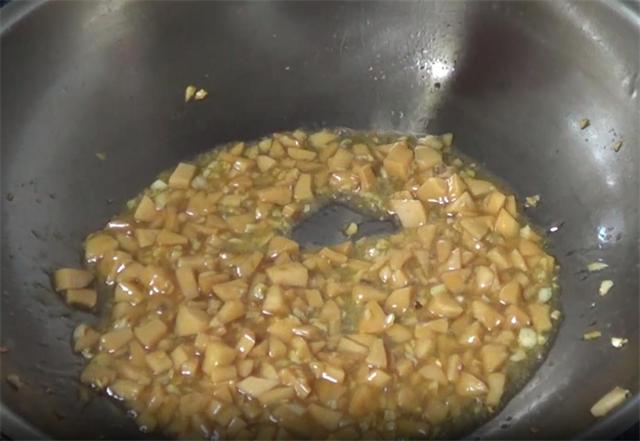 4.然后起锅加入少量的油,油热之后下入蒜末,炒香之后下入火腿碎,然后加入少量的白糖,再倒入适量的酱油,然后加入盐,炒匀之后,加入水淀粉。