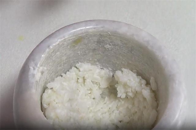 3.拌匀之后,我们再放入捣蒜缸中,然后把这个米饭再捣的细腻一些。