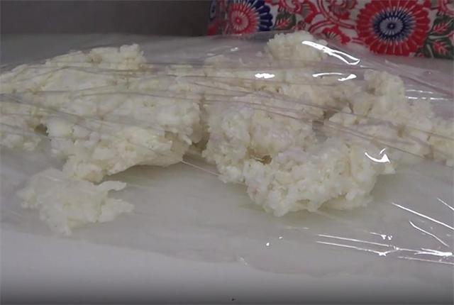 5.我们再取一张保鲜膜,捣好的米饭铺在保鲜膜上,然后用保鲜膜的另一侧,把米饭盖好,如果家里有保鲜袋是最好的,直接把米饭放在里面就可以了。