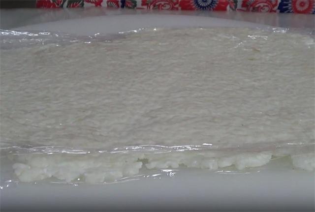 7.米饭饼冻好之后,我们把上面的膜撕掉,我们再把米饭饼切成合适的块状。