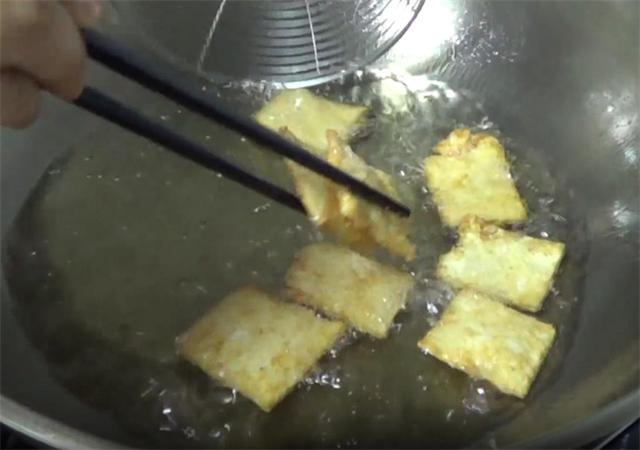 8.切好之后,起锅加入多一点的油,油温七成热的时候,下入切好的米饭饼,一直大火炸,把两面都炸至金黄。