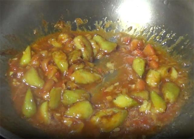 6.锅中留有底油,加入姜蒜末,然后下入西红柿,再加入少量的酱油,炒软之后加入番茄酱,然后翻炒均匀,再倒入茄子,炒匀之后加入少量的水,焖两分钟之后,加入适量的盐,然后炒匀就可以出锅了。