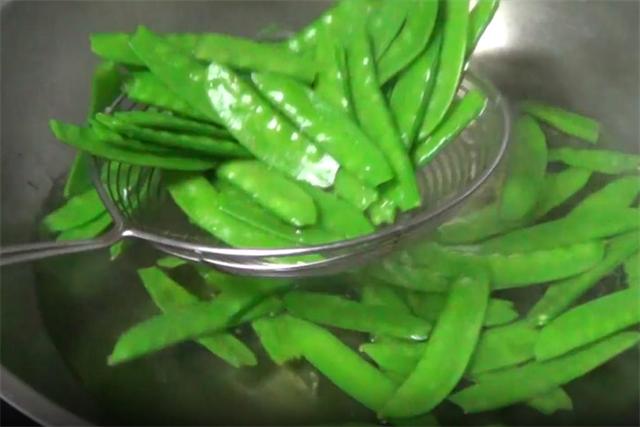 2.然后起锅把水烧开,加入少量的盐,我们先把荷兰豆焯水,荷兰豆变成深绿就可以捞出了。