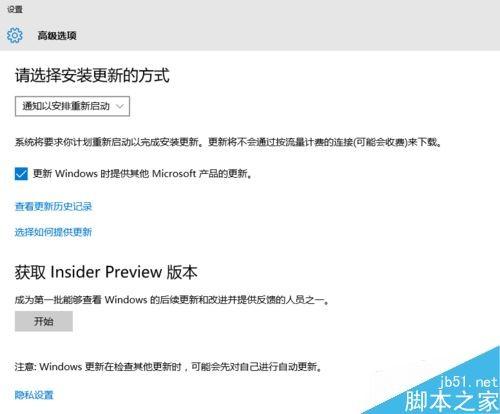 在进入到高级选项设置中后,如下图所示,选择《查看更新历史记录》菜单,提醒下win10是没有不更新的选项的。