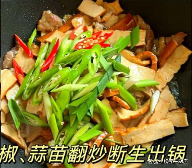 一转眼就要结束九月份,十月份正在向我们招手,十月是人们喜欢的日子,因为要放小长假,终于摆脱上班的时候,可以好好放松一下,可以晚一点起床,准时准点吃饭,每天可以自己在家做饭吃。到了秋季,本身市面上的蔬菜就变少了,最近蔬菜价格都很贵,感觉都吃不起了,今天上超市购买一些香干和猪肉,准备搭配蒜苗和辣椒制作一道美味家常菜——蒜苗辣椒香干炒肉片,菜色非常诱人,香嫩可口,总吃不腻,学会给家里人尝一尝。许多人还是第一次吃这道蒜苗辣椒香干炒肉片,快点跟着小编学起来,比饭店还好吃。十月,有钱没钱,多给家人吃这菜,营养又美味,不懂吃可惜了。  【蒜苗辣椒香干炒肉片的详细做法】 准备一些食材:新鲜大蒜苗两根(大蒜苗又叫大蒜叶,是大蒜在生长期的嫩尖,叶片有着独特的香味,能够起到配色和刺激味蕾的作用),小米辣和杭椒若干个,新鲜攸县香干200克(香干是一种口感很好的豆制品,营养价值出色,荤素都能够搭配,搭配各种食材一起吃),少许食用油,一些大蒜头,姜片几片,新鲜猪肉半斤(要选择肥肉相间的猪肉,肉质要色泽红润,肉质要非常有弹性),少许红薯电费,食盐少许,生抽和料酒少许,胡椒粉少许,其他调味品。 详细制作顺序:第一步:提前选购好香干,大蒜苗,猪肉和辣椒等食材,将大蒜苗的根部切掉,掐掉不新鲜的叶片,彻底清洗干净,斜切成若干小段,放在一边备用。 第二步:将香干都用清水浸泡,切成若干长条,锅里煮一些清水,加上半勺食盐,倒入香干焯烫半分钟,去掉豆腥味,控干水分即可。第三步:将小米辣和杭椒去蒂,反复清洗干净,切成若干细丝,大蒜剥掉外皮,切成一些蒜片,几片生姜切成细末,备用。第四步:将新鲜猪肉肥肉分开,洗净后切成薄片,瘦肉片放在器皿中,加上少许红薯淀粉,加上生抽和蚝油半勺,滴入一些食用油,锁住肉片的水分,把肉片充分腌制入味。 第五步:锅底慢慢烧热,加上肥肉煸炒出肥腻的油脂,倒入腌制好的瘦肉,快速大火爆炒片刻。