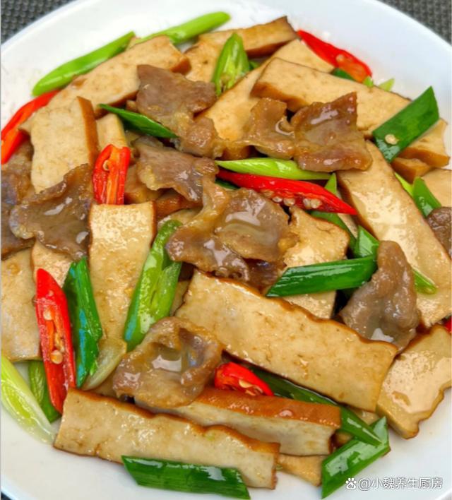 第六步:加上少许蒜片和姜片,倒入一些香干片,加上生抽和蚝油各一勺,调入一小勺食盐调味。 第七步:加上一些青红辣椒和蒜苗,调入少许水淀粉,用锅铲翻炒均匀,收汁出锅,这道蒜苗辣椒香干炒肉片就可以开吃了,吃起来特别下饭。 蒜苗辣椒香干炒肉片是一道特别美味的菜肴,选用蒜苗,辣椒,香干和猪肉制作完成,肉片特别鲜嫩,搭配一些配菜,吃起来喷香下饭,补足营养,胃口越来越好。 网友们,你们是否掌握这道蒜苗辣椒香干炒肉片的正确做法吗?(文中的配图全部出自网络)