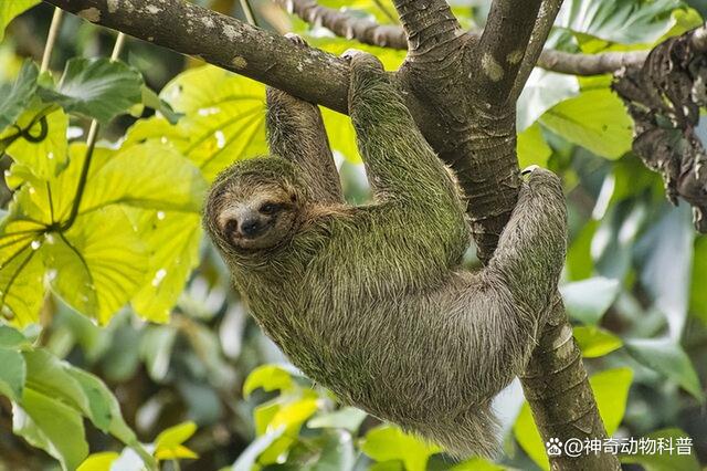 三趾树懒是树懒科、树懒属的哺乳动物。它们的头小而圆,体长约50-60厘米,身上长有粗糙的针毛,毛色原本为灰棕色,但后来会变成绿色。三趾树懒终生在树上生活,不能在地面站立或行走,其平均移动速度约为每小时162米,常常几小时不动,因此很难被发现。每天会睡眠15小时以上,是世界上行动最缓慢的动物之一。 6、加拉帕戈斯象龟(300米/小时)