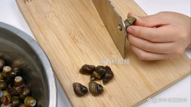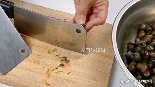 接着再准备另一把菜刀,用刀背敲去螺蛳露出来的尾部就可以了。这样就轻松将螺蛳尾给去除了,方法简单又快速。