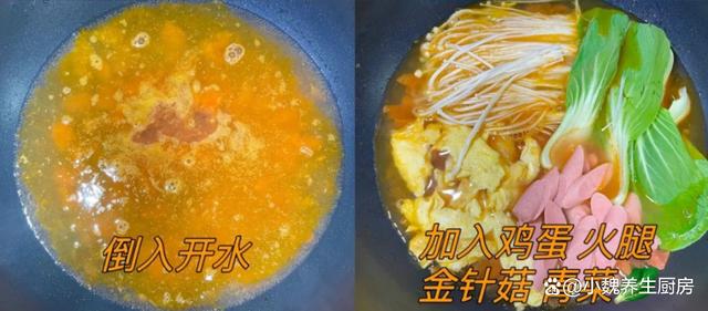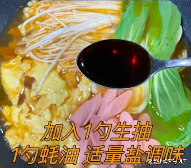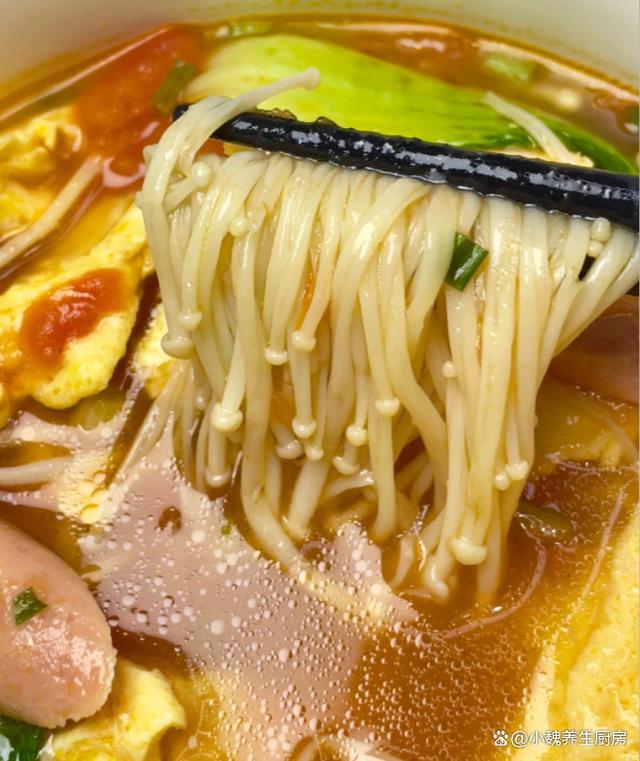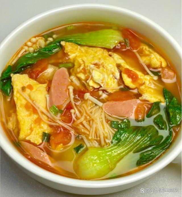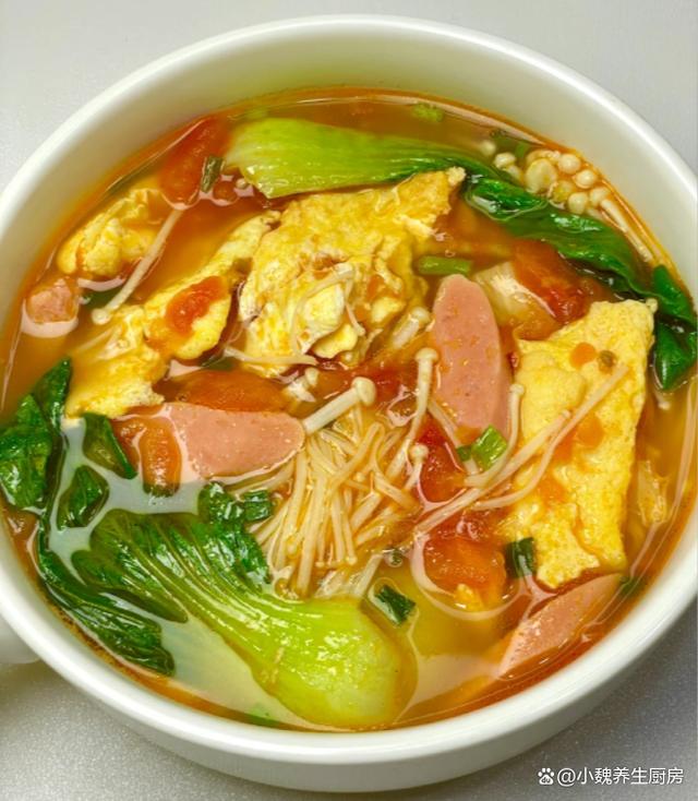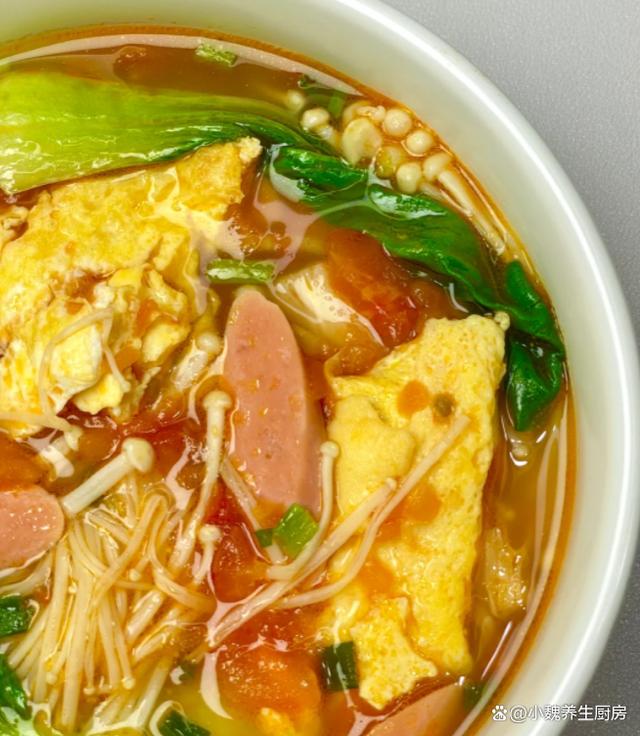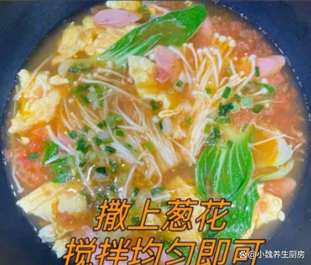 第八步:撒上一些细葱花,关火盛出即可,这道番茄金针菇火腿鸡蛋汤就可以开吃了。 番茄金针菇火腿鸡蛋汤的制作小贴士:首先,挑选新鲜的番茄是关键,色泽鲜红、表皮光滑无裂口的番茄,不仅汁水丰盈,更能为汤底增添一抹亮丽的色彩与自然的酸甜。切番茄时,不妨先在其底部划上十字刀,用开水焯烫片刻,这样不仅能轻松去皮,还能让番茄的酸甜更好地融入汤中。 金针菇作为这道汤的“鲜”字担当,清洗时需仔细,轻轻撕开成小簇,去除根部杂质,确保每一口都是纯净的鲜美。同时,金针菇不宜久煮,以免失去其脆嫩的口感和丰富的营养成分,最好在汤即将出锅前几分钟加入。其次,至于鸡蛋,需要提前煎熟,然后分成小块,是这道汤的点睛之笔。最后,别忘了在出锅前撒上一把翠绿的葱花,不仅提升了整道汤的视觉效果,更以其独特的香气为这道番茄金针菇火腿鸡蛋汤画上了完美的句号。这样一碗色香味俱全的汤品,定能让你的餐桌增添不少温馨与满足 番茄金针菇火腿鸡蛋汤是一款酸甜开胃的家常汤品,里面包括番茄,金针菇,火腿肠和鸡蛋,价格都不贵,色泽非常好看,营养价值很出色,刺激味蕾,全家人都爱吃它。网友们,你们是否吃过这道番茄金针菇火腿鸡蛋汤呢?(文中的配图全部出自网络)