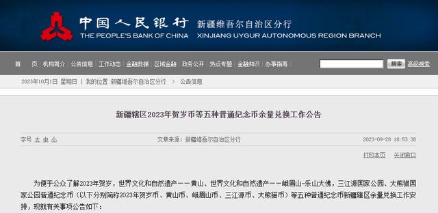 在最先公布的4个地区公告中,余量兑换都是在10月9日开启,也就是在节后没几天,我们就可以兑换纪念币了。 不过在节前压哨公布的新疆地区余量兑换公告中,提到了新的兑换时间!