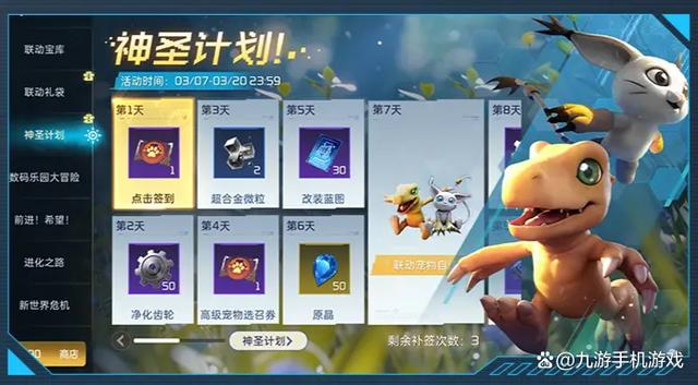 本次的联动是在3月7号开启。联动的主要内容是数码宝贝的第一部。首先联动的第一个活动是神圣计划,这个是一个签到的活动,玩家们在活动期间每一次登录都会获得一些奖励。到第七天的时候玩家们可以获得联动宠物,宠物在亚古兽或者迪路兽进行二选一。