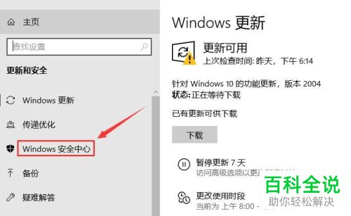 3. 如图,在打开的页面,点击左侧的windows安全中心选项。