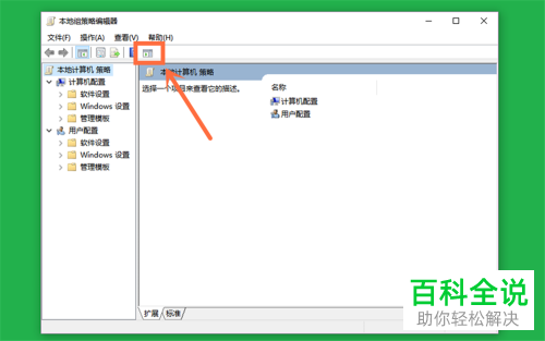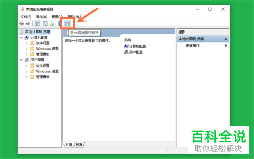 3. 第三步打开【本地组策略编辑器】窗口后,根据下图箭头所指,找到并点击【显示/隐藏操作窗格】图标。