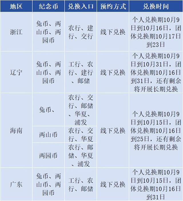 这5枚纪念币分为3个系列,依次是生肖贺岁系列、双遗产系列和国家公园系列。同一个系列的,必须成组预约。 此外,兑换上限也是全国统一的,每人每种都可以预约20枚(组),每人还可以最多代领5人。 兑换安排目前,已有浙江、辽宁、海南和广东陆续公布了当地的兑换工作安排。 4地公布的兑换开始时间相同,都是10月9日,但持续时间不一样。百科网也给大家整理好了。